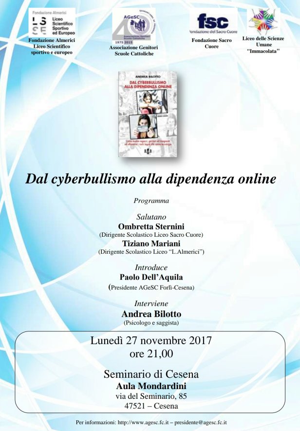 L’ Associazione Genitori Scuole Cattoliche, in collaborazione con la Fondazione Sacro Cuore, con il Liceo Scientifico sportivo e europeo Almerici e con il Liceo delle Scienze Umane “Immacolata”, promuove lunedì 27 novembre un incontro sul tema “Dal cyberbullismo alla dipendenza online”, a partire dall’omonimo volume dello psicologo Andrea Bilotto. Il dibattito sarò preceduto dai saluti di Ombretta Sternini (Dirigente Scolastico Liceo Sacro Cuore) e Tiziano Mariani (Dirigente Scolastico Liceo “L.Almerici”) e introdotto da Paolo Dell’Aquila (Presidente AGeSC Forlì-Cesena). Interverrà poi l’autore del volume Andrea Bilotto, lasciando uno spazio per le domande del pubblico. L’incontro si svolgerà nel Seminario di Cesena alle 21 ed analizzerà il ruolo dialogico e relazionale che famiglia e scuola devono assumere nei confronti dei ragazzi, per prevenire comportamenti devianti o dipendenza dalla rete.