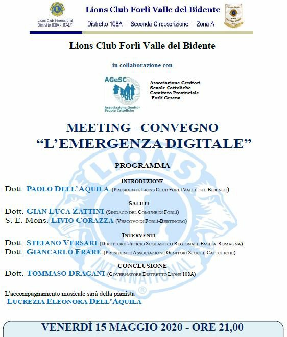 Durante l’incontro si presenterà il drammatico problema della formazione online in Italia, che rischia di non raggiungere diverse fasce scolastiche e di escludere bambini e ragazzi non abbienti .Si ricorderanno, inoltre, i grossi problemi di gestione familiare, causati dagli esperimenti di teledidattica attuali, che potrebbero peggiorare se protratti nel prossimo anno scolastico. Il meeting sarà introdotto da Paolo Dell’Aquila (Presidente Club Forlì Valle del Bidente) e vedrà i saluti del Sindaco di Forlì Gianluca Zattini e del Vescovo di Forlì–Bertinoro S.E. mons. Livio Corazza.