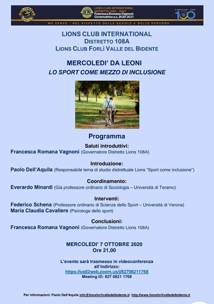 Con la videoconferenza si intende sensibilizzare sia i Lions sia la società civile sulle problematiche legate alla funzione dello sport come mezzo di inclusione dei soggetti più deboli e oggetto di discriminazioni, a causa del sesso, dell’età, delle condizioni sociali o dell’appartenenza religiosa o etnica.