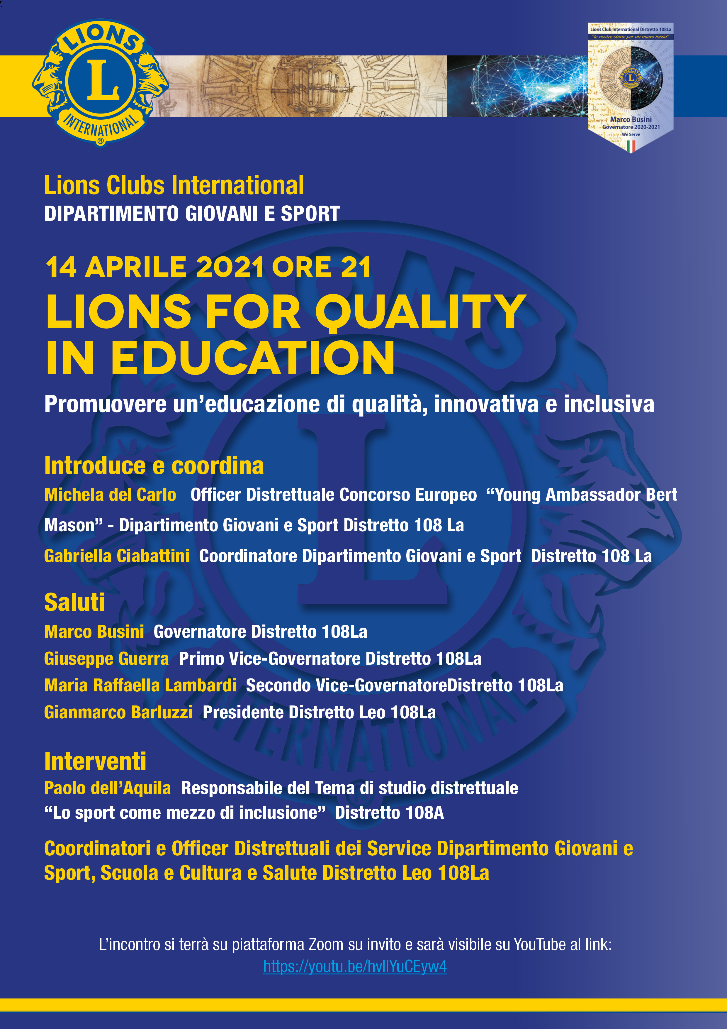 Mercoledì 14 aprile alle 21 si svolgerà il meeting del Distretto 108LA “Lions for Quality in Education” , dove