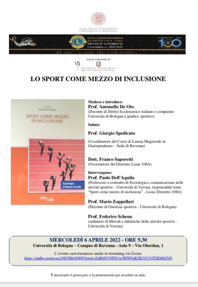 Ho il piacere di invitarvi alla conferenza “Sport come come mezzo di inclusione”, organizzata dal Distretto 108A e dall’Università di Bologna – Campus di Ravenna mercoledì 6 aprile alle 9,30. Vi invito a partecipare o in presenza o, meglio, via Zoom.