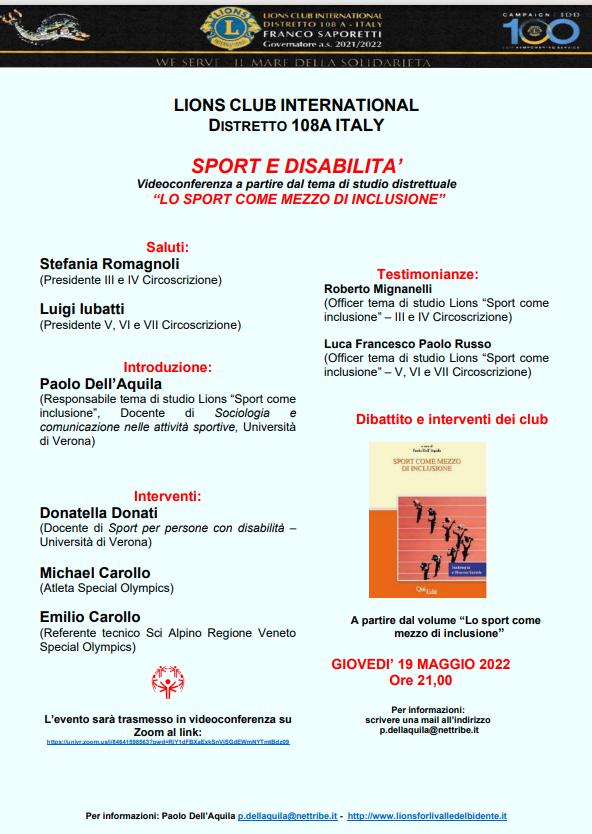 Il Distretto Lions 108A organizza giovedì 19 maggio alle ore 21 una videoconferenza su “Sport e disabilità”, a partire dal tema di studio distrettuale 20-21 “Lo sport come mezzo di inclusione”, rivolta specificamente alla Circoscrizioni III, IV, V, VI e VII.
