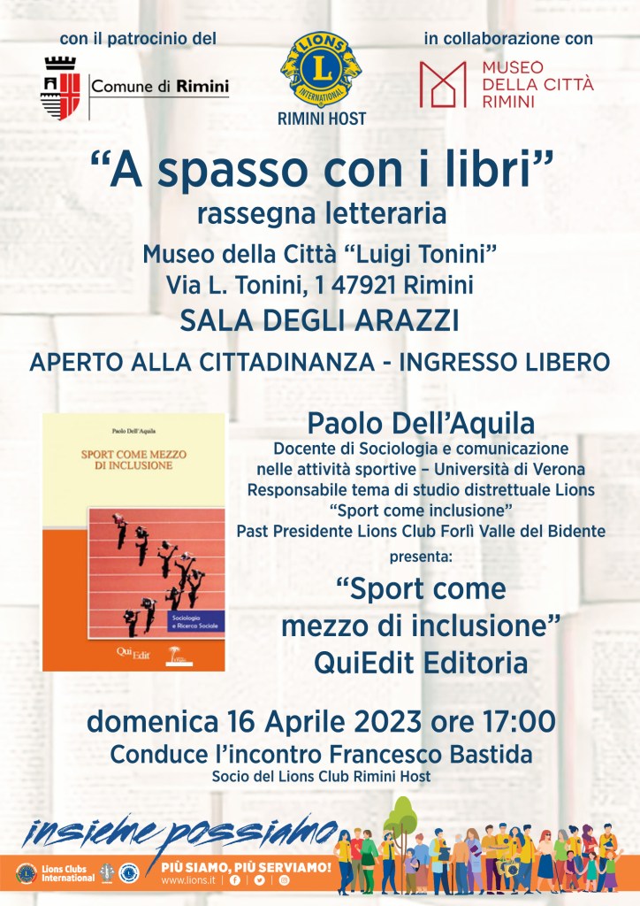 Il Lions Club Rimini Host ha organizzato domenica 16 aprile alle 17 presso il Museo della Città la presentazione del volume “Sport come mezzo di inclusione con il curatore del libro Paolo Dell’Aquila. Saranno presenti il presidente del Lions Club Rimini Host Carla Amadori e il giornalista sportivo Francesco Bastida.