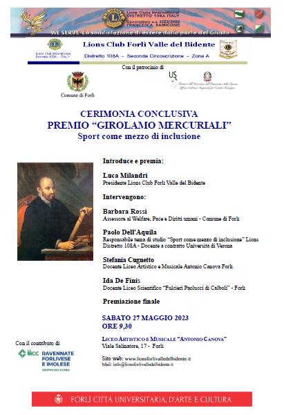 Sabato 27 maggio alle 9,30 si svolgerà la cerimonia finale del Premio Girolamo Mercuriali. Introdurrà e premierà gli elaborati multimediali Luca Milandri (Presidente Lions Club Forlì Valle del Bidente). Porteranno i loro saluti Barbara Rossi (Assessore al Welfare, Pace e Diritti umani – Comune di Forlì), Paolo Dell’Aquila (Responsabile tema di studio “Sport come mezzo di inclusione” Lions Distretto 108A – Docente a contratto Università di Verona), Stefania Cugnetto (Docente Liceo Artistico e Musicale Antonio Canova Forlì), Ida De Finis (Docente Liceo Scientifico “Fulcieri Paolucci di Calboli” – Forlì).