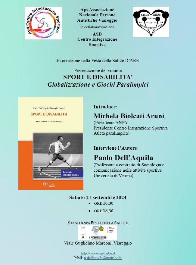 ASD Centro Integrazione Sportiva presenta il volume di Paolo Dell’Aquila e Donatella Donati sabato 21 settembre presso la Festa della Salute a Viareggio.