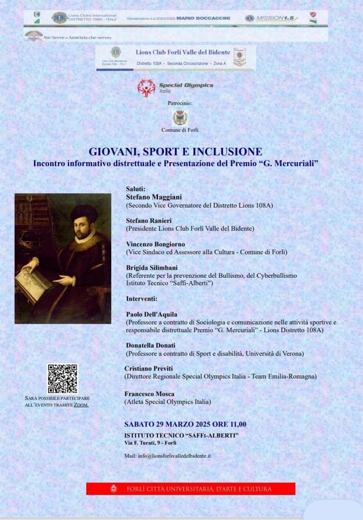 Sabato 29 marzo alle ore 11 presso l’Istituto Saffi-Alberti si svolgerà il convegno distrettuale, organizzato dal Lions Club Forlì Valle del Bidente, su “Giovani, Sport e inclusione” (svolta in collaborazione con Special Olympics Italia – Team Emilia-Romagna). Saranno impegnati Stefano Maggiani (Vice Governatore Lions del Distretto108A), Stefano Ranieri (Presidente Lions Club Forlì Valle del Bidente), Vincenzo Bongiorno (Vice Sindaco del Comune di Forlì), Paolo Dell’Aquila (coordinatore distrettuale del tema), Donatella Donati (docente di Sport e disabilità, Università di Verona), Cristiano Previti (Direttore Regionale Special Olympics Italia – Team Emilia-Romagna) e l’atleta Francesco Mosca.
