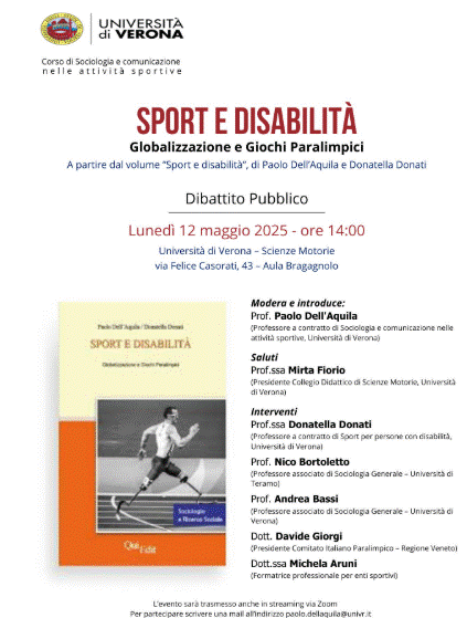 Lunedì 12 maggio alle 14 si volgerà un dibattito presso l’Università di Verona a partire dal volume “Sport e disabilità” di Paolo Dell’Aquila e Donatella Donati. Oltre agli autori, saranno Mirta Fiorio (Università di Verona), Nico Bortoletto (Università di Teramo), Andrea Bassi (Università di Bologna), Davide Giorgi (CIP Veneto) e Michela Aruni.